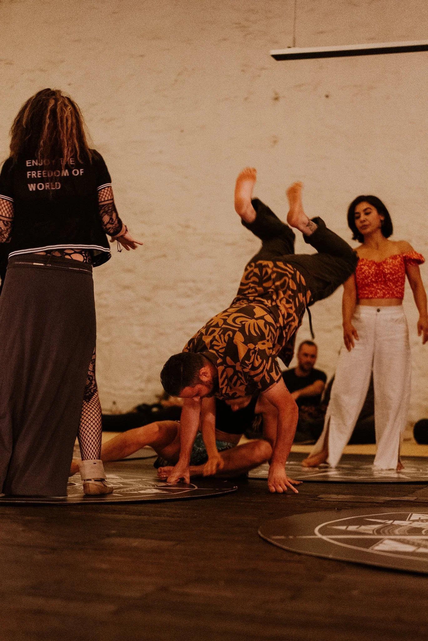 Next, we flow into lightly guided movement, followed by free dance and expression.